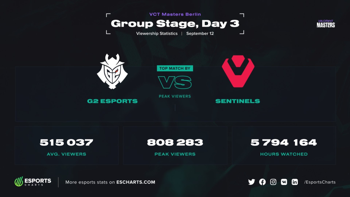 A partida válida pela fase de grupos do Masters Berlin teve os três mapas jogados. A Sentinels, que venceu as duas edições anteriores do torneio, viu a invencibilidade de mapas em LAN cair diante da G2. A partida que foi bem disputada, teve um pico de mais de 808 mil espectadores somando as cinco plataformas que transmitiam o jogo: Afreeca TV, Facebook, Twitch e VK Live.