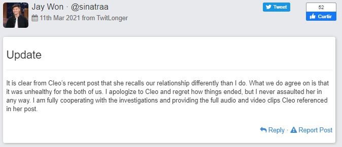 Jay “sinatraa” Won quebrou o silêncio, nesta quinta-feira (11), após ser acusado pela ex-namorada Cleo “cle0h” Hernandez de abuso sexual. O jogador da Sentinels pediu desculpas, lamentou como o relacionamento terminou, mas garantiu que “nunca a agredi de alguma forma“.