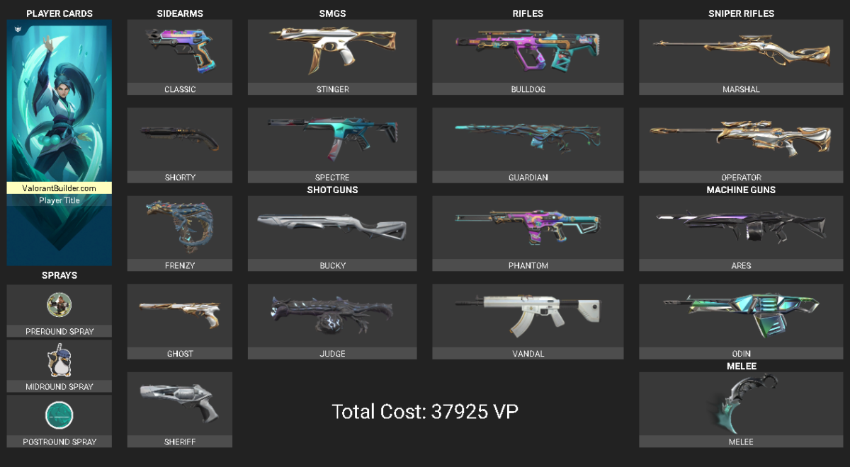 O site VALORANT Inventory Builder é um site gratuito onde os jogadores podem criar um inventário totalmente personalizado desenvolvido pelo usuário DimaArtikx. Esta página permite que você veja todas as skins para cada arma para construir o inventário personalizado ideal.