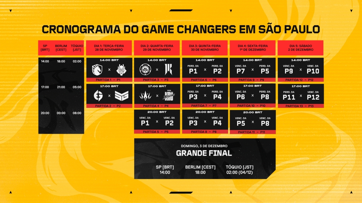 Além dos primeiros confrontos de cada equipe, a Riot Games também divulgou a programação completa do Game Changers Championship. O campeonato começa no dia 28 de novembro e se estende até o dia 3 de dezembro.