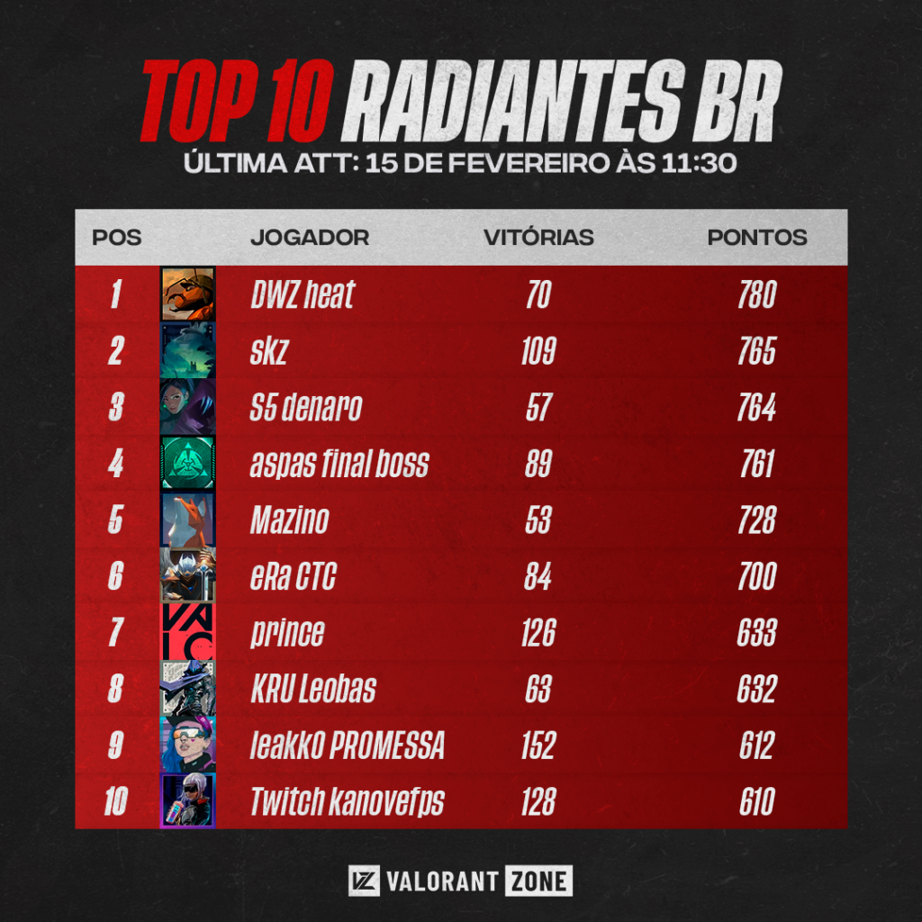 Após duas semanas com skz na liderança do ranking competitivo, foi a vez de heat assumir o topo. O jogador da DELIRAWOWZK1 está em primeiro com 780 pontos e 70 vitórias.