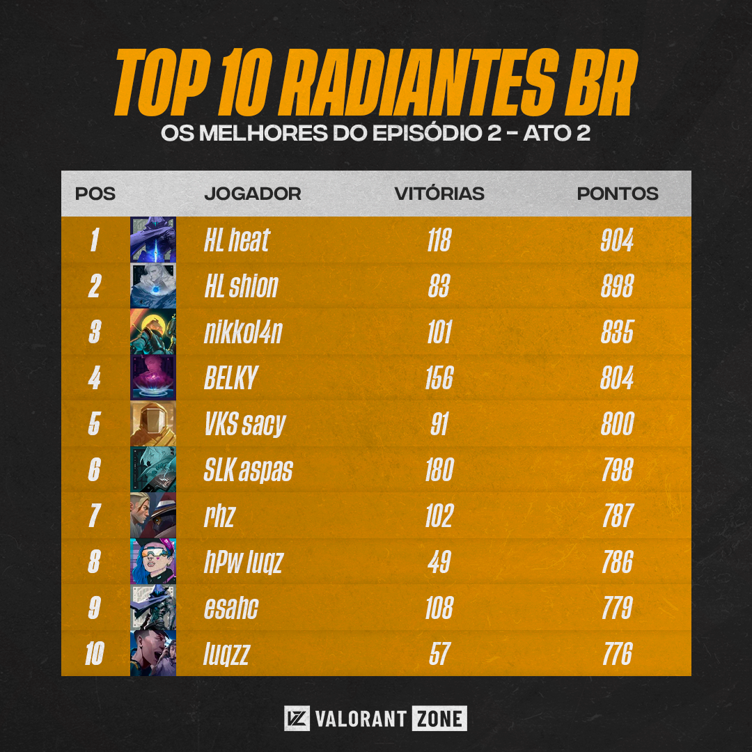 Olavo “heat” Marcelo encerrou o Ato 2 como líder do Top 10. O jogador encerrou com 904 pontos e 118 vitórias. Em seguida o companheiro de equipe Gabriel “shion” Vilela, que chegou aos 898 pontos e 83 vitórias. Encerrando o pódio está Rafael “NikkoLAN” Fernandes. Ex-jogador da Vivo Keyd chegou aos 835 pontos. Até uma semana atrás o duelista não aparecia entre os dez primeiros.