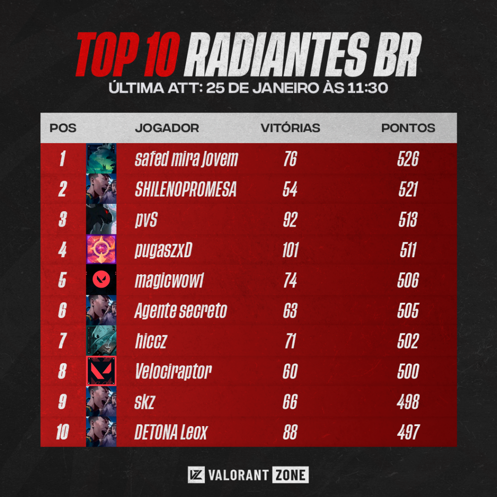 O Top 10 desta semana conta com mais jogadores profissionais que o da anterior. Semanalmente, a fim de dar mais visibilidade aos jogadores, o VALORANT Zone divulgará a lista dos melhores do servidor brasileiro. Esta foi fechada nesta segunda às 11h30 (de Brasília)