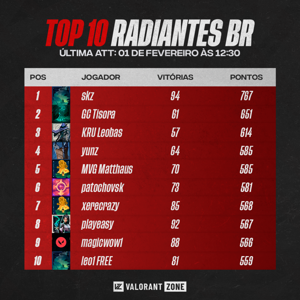 Semanalmente, a fim de dar mais visibilidade aos jogadores, o VALORANT Zone divulgará a lista dos melhores do servidor brasileiro. Esta foi fechada nesta segunda às 12h30 (de Brasília).