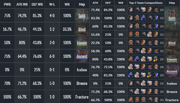 Tendo em vista a quantidade de partidas jogadas em cada cenário, os melhores mapas da DRX são Ascent (6), Breeze (5) e Split (4) já que em todos eles o aproveitamento é de 100%. Já na Bind, são duas derrotas e uma vitória, enquanto na Icebox é uma derrota em uma vez jogado.