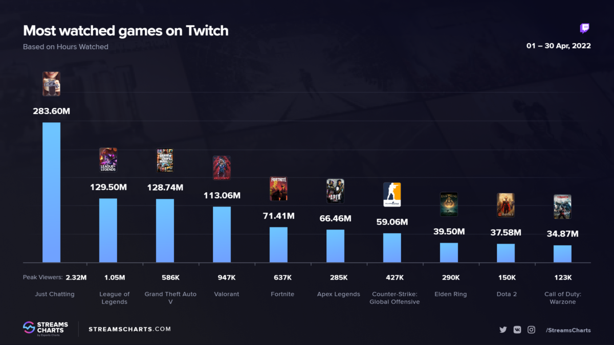 A Stream Charts, site de análise de público de plataformas de streaming, revelou nesta terça-feira (2) os jogos e influenciadores mais assistidos durante o mês de abril na Twitch. O VALORANT ficou em 4º lugar com mais de 113 milhões de horas assistidas.