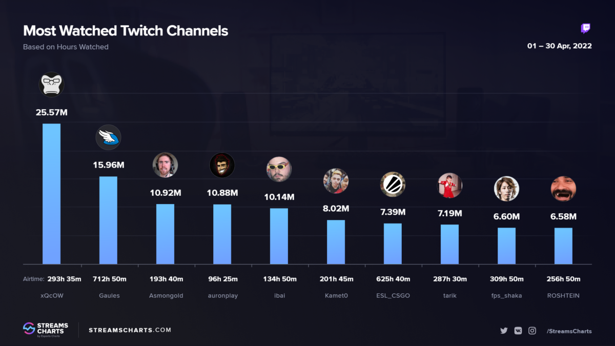 Em questão de streamers, o brasileiro Alexandre “Gaules” Borba ficou em 2º lugar como o mais assistido da plataforma no mundo todo. O influenciador teve 15.96 milhões de horas assistidas, perdendo apenas para Félix “xQc” Lengyel com 25.57 milhões. Em 8º na lista Tarik “tarik” Celik marcou presença, o ex-jogador de CS e atualmente streamer de VALORANT, o norte-americano foi um dos influenciadores que fez Watch Party durante o Masters Reykjavík 2022.