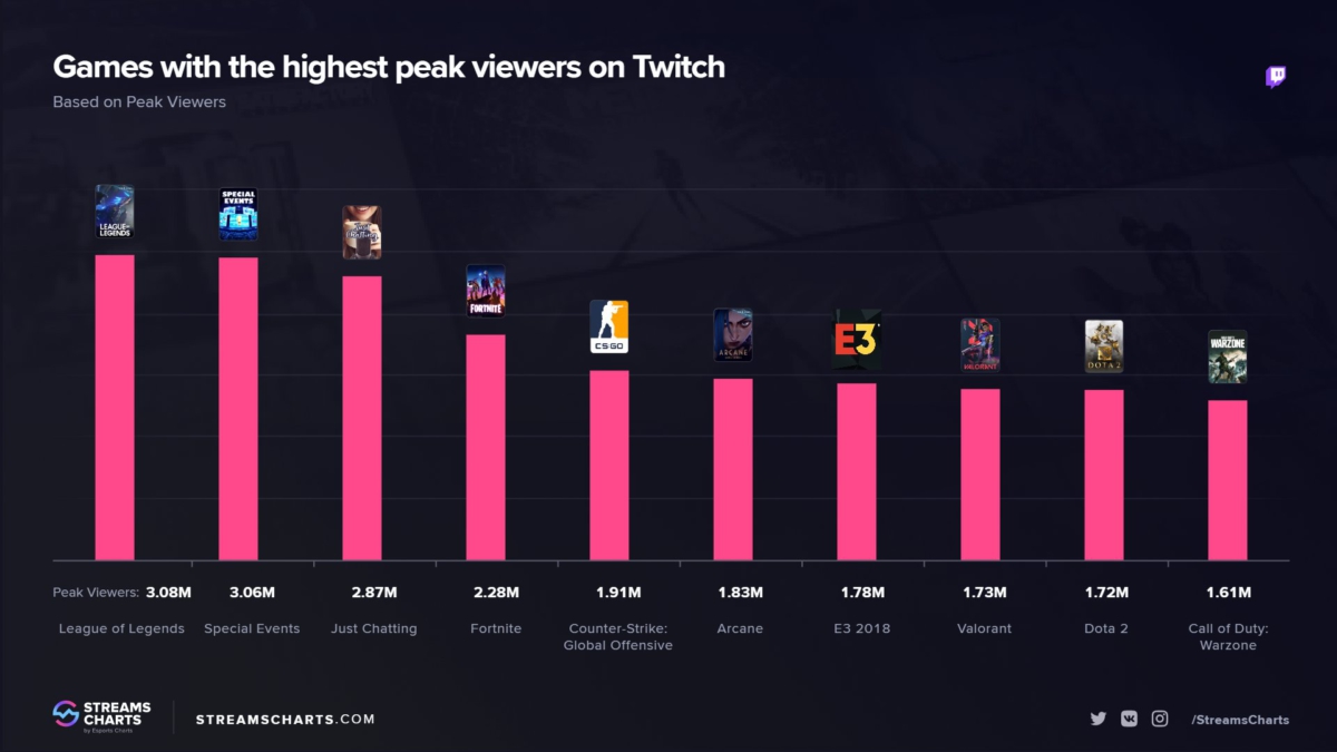 O League of Legends, outro título da Riot Games lidera a lista com um pico de 3.08 milhões de espectadores. Em segundo lugar é a categoria “eventos especiais” com 3.06 milhões. Já o terceiro lugar aparece a categoria “Just chatting” da plataforma da Twitch.