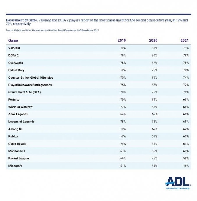 O estudo, que começou em 2019 pelo site, teve o Dota 2 como jogo mais tóxico na época e também em 2020. Contudo, em 2021 o VALORANT surgiu como o jogo online mais tóxico com aproximadamente 79%, um 1% a mais do Dota 2. Em outro gráfico, mostra que 48% do assédio é feito através do uso da ferramenta de voz do jogo e 39% através do chat de texto do jogo.