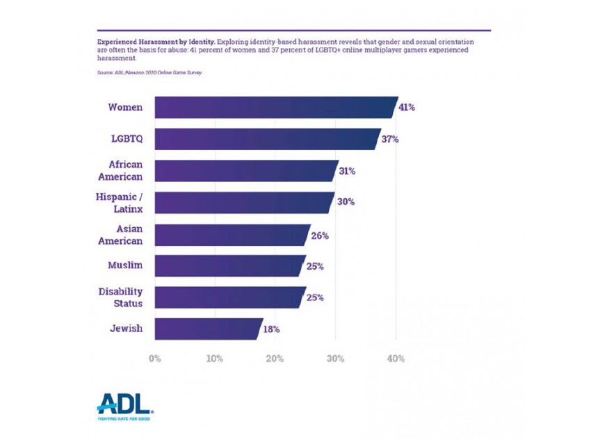 Outros dados da pesquisa mostraram que, cinco em cada seis adultos (83%) com idades entre 18 a 45 anos já sofreram algum tipo de assédio em jogos online. Já três em cada cinco jovens (70%) com idades entre 13 a 17 anos já sofreram assédio em jogos online. Em relação ao público específico que sofre esse tipo de assédio, 53% foram com base em raça (etnia), religião, gênero ou orientação sexual. No caso, gênero e orientação sexual costumam ser os motivos dos abusos online, sendo que 41% são mulheres e 37% dos jogadores online LGBTQ+ sofrem assédio.