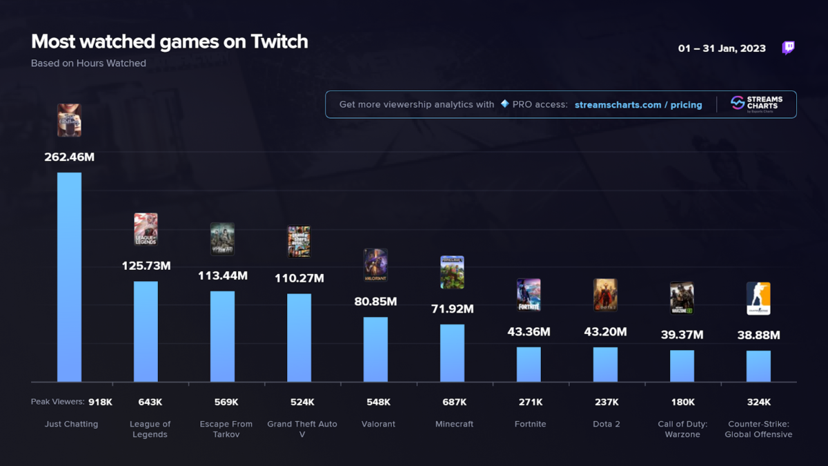 Na lista que contém 10 jogos, a categoria Just Chatting da Twitch ficou no 1º lugar, mas como não se trata de um jogo, ela não faz parte do ranking. O VALORANT ficou atrás apenas do League of Legends, Escape From Tarkov e do GTA V.