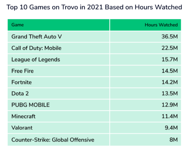 A pesquisa também divulgou os resultados na plataforma Trovo, concorrente da Twitch. Com menos espectadores, o VALORANT atingiu 9,4 milhões de horas assistidas. Entretanto, ainda está a frente do CS:GO, que ficou com 8 milhões. O fps da Riot Games ocupou a nona colocação e o da Valve logo atrás em 10º.