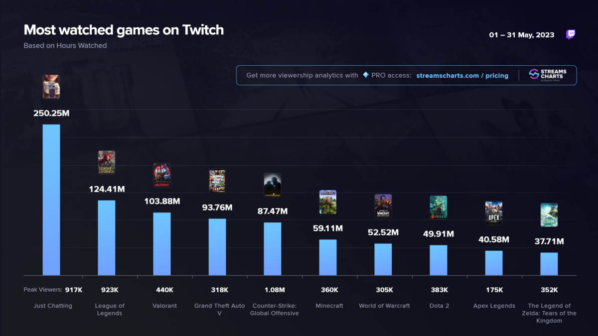 De acordo com o Streams Charts, o Just Chatting é a categoria mais popular da plataforma. Ela é uma categoria exclusiva da Twitch que serve para os streamers conversarem ou assistirem algo com os espectadores. Como não é vista necessariamente como um jogo, o VALORANT pode ser considerado o segundo mais assistido no mês de maio, ficando logo atrás de League of Legends.