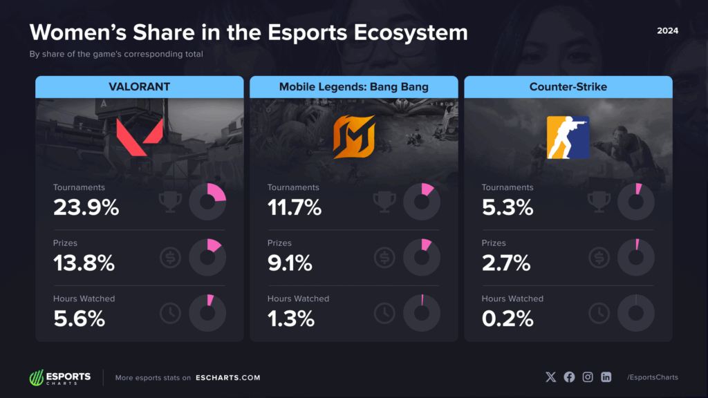 Em 2024, os Esports femininos somaram pouco menos de US$ 3 milhões em premiação. Desse total, mais de US$ 1,2 milhão vieram de campeonatos de VALORANT. Isso equivale a 13,8% do total de prêmios distribuídos pela Riot em competições do jogo — porcentagem cinco vezes superior à do Counter-Strike, que destinou apenas 2,7% ao cenário inclusivo.