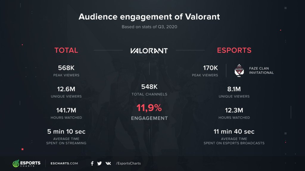 Em oitavo lugar na lista, o jogo segue a frente de jogos de sucesso, como Counter-Strike: Global Offensive e Minecraft. O FPS da Riot teve um pico de 568 mil espectadores simultâneos no quadrimestre se somado todos os canais de transmissão na plataforma.