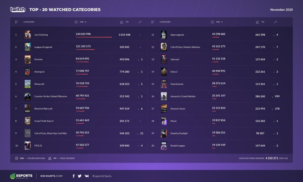 Dados apresentados pelo Esports Charts nesta semana revelaram que VALORANT perdeu duas posições na lista de jogos mais assistidos da Twitch em todo o mundo durante o mês de novembro. Agora, o FPS da Riot Games ocupa a 13ª posição.