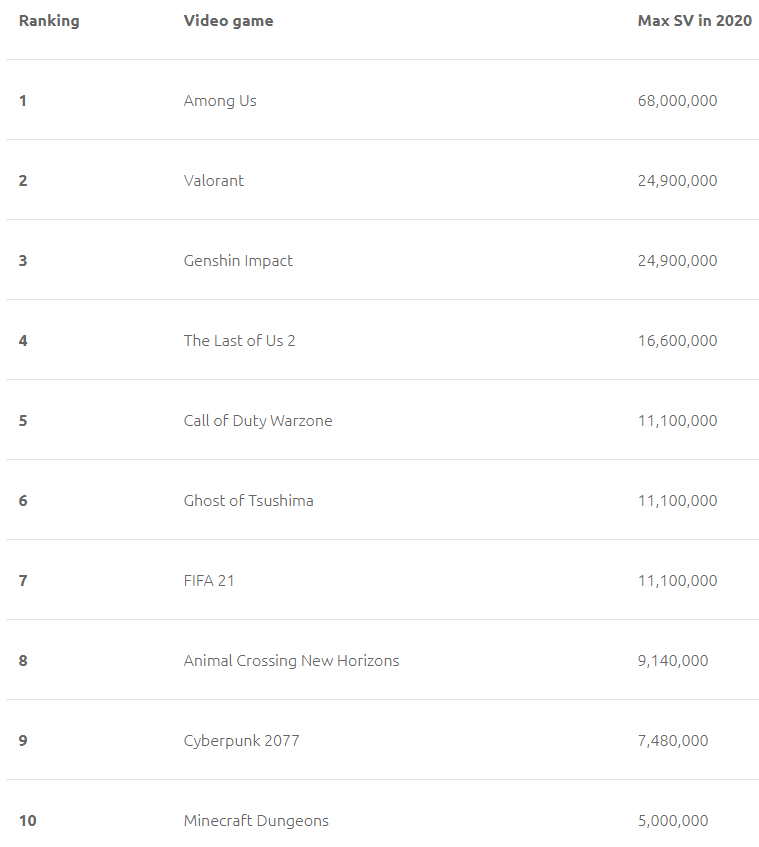 O terceiro colocado teve um empate técnico com VALORANT: Genshin Impact, outro lançamento de 2020, teve também em seu melhor mês cerca de 24,9 milhões de buscas relacionadas.