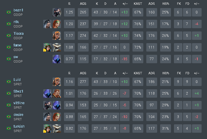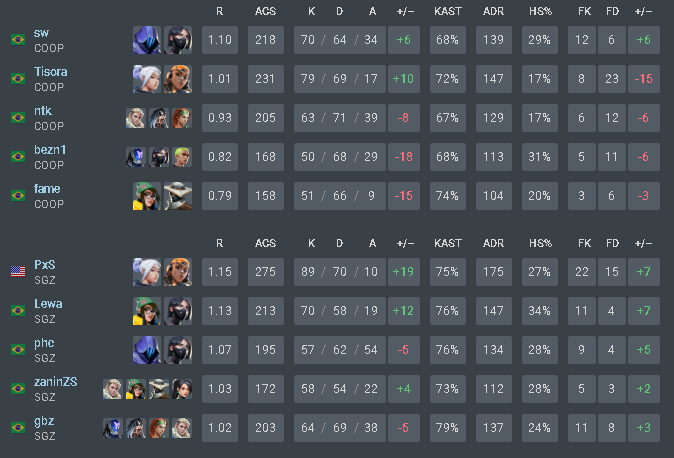 A SAGAZ venceu a CO-OP por 3 a 1 e garantiu sua vaga no VCB 2024. A equipe venceu na Ascent (14×12), perdeu na Lotus (13×11), mas voltou a triunfar na Split (13×8) e Icebox (13×8) para garantir seu lugar na segunda etapa do torneio. Veja os números da série: