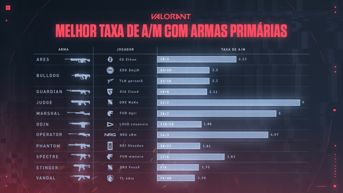 O uso de três armas foi melhor aproveitado por três jogadores brasileiros durante a temporada de 2023 da VALORANT Champions Tour. Leonardo “mwzera” Serrati e Douglas “dgzin” Souza, da FURIA; e Cauan “cauanzin” Pereira, da LOUD, lideraram na relação abates/mortes com as armas Spectre, Marshal e Odin.