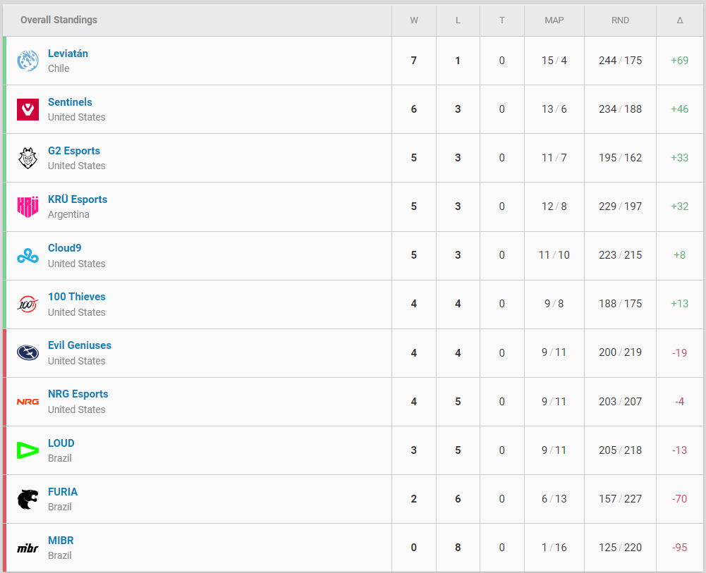 Com duas equipes classificadas para os playoffs do VCT Americas, a tabela do torneio segue bastante indefinida. KRÜ Esports, G2 Esports e Cloud9 garantiram uma boa posição por conta dos resultados no Stage 1, mas ainda correm riscos nesta etapa do campeonato. A 100 Thieves vive a situação mais delicada entre os times da zona de classificação, ocupando a sexta posição, com quatro vitórias.