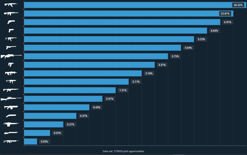 Como mencionado anteriormente, a Vandal foi a queridinha dos jogadores, com 36.32% de taxa de escolha, totalizando 5.979 compras. Logo em seguida vem a Phantom, com 3764 picks e Sheriff, com 1138. Confira a porcentagem de compra de cada arma:
