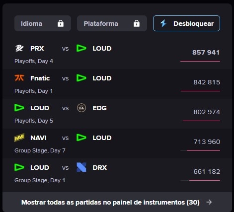 Com a marca alcançada neste domingo, a LOUD esteve presente nas seis partidas mais assistidas de todo o campeonato. O jogo contra a Paper Rex, realizado no último sábado (19), atingiu a marca de 857.941 espectadores simultâneos.