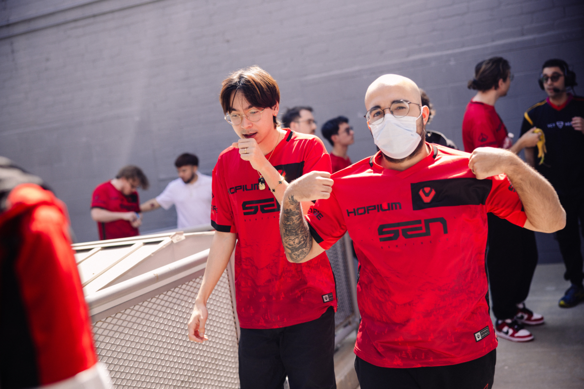 Capa: "TenZ" (L) and "Sacy" of Sentinels backstage during Week 3 of VCT Americas Stage 1 at the Riot Games Arena on April 20, 2024. (Photo by Colin Young-Wolff/Riot Games)